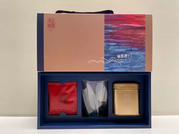 禮盒外觀宛如羅浮宮珍藏的藝術畫作,展現東峰紅茶莊園的匠心美學。內附玻璃杯線條優雅,彷彿南投層巒起伏的山形。注入日月潭紅茶,茶色澄澈如湖水,靜靜沉於杯底,映出一片寧靜如詩的風景。日月潭特有的氣候與土壤孕育出熟果蜜香與溫潤茶韻的日月潭紅茶。茶香與藝術相融,在啜飲之間展開一場觸動感官與心靈的雅緻盛宴。
